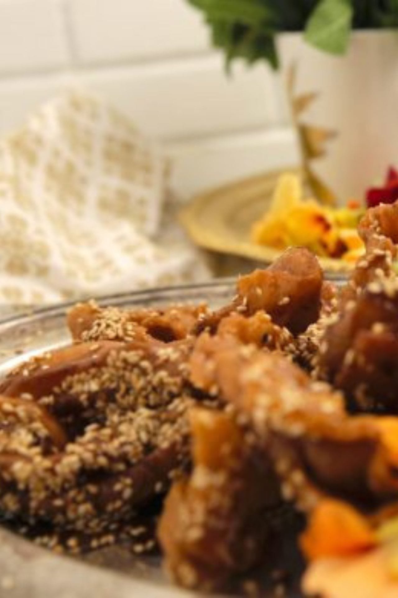 We take out the fried pieces from the oil and filter/strain them, then put them in thick syrup. Put in the serving dish, and sprinkle them with roasted sesame and serve
