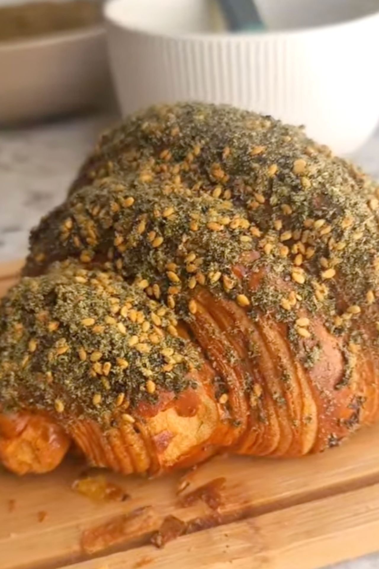 Slice the croissant from the top diagonally, make to cuts opposite each other and remove the slice.